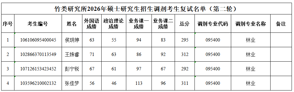 竹类研究所2026年硕士研究生招生调剂考生复试名单(第二轮)公布