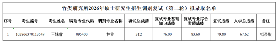 根据《竹类研究所2026年硕士研究生招生复试和录取工作实施细则》、《竹类研究所2026年硕士研究生招生接受调剂公告(第二轮)》等文件要求及相关工作安排,经过竹类研究所复试、初审,研究生院审核,确定2026年竹类研究所硕士研究生调剂(第二轮)拟录取名单,现将拟录取名单予以公示。